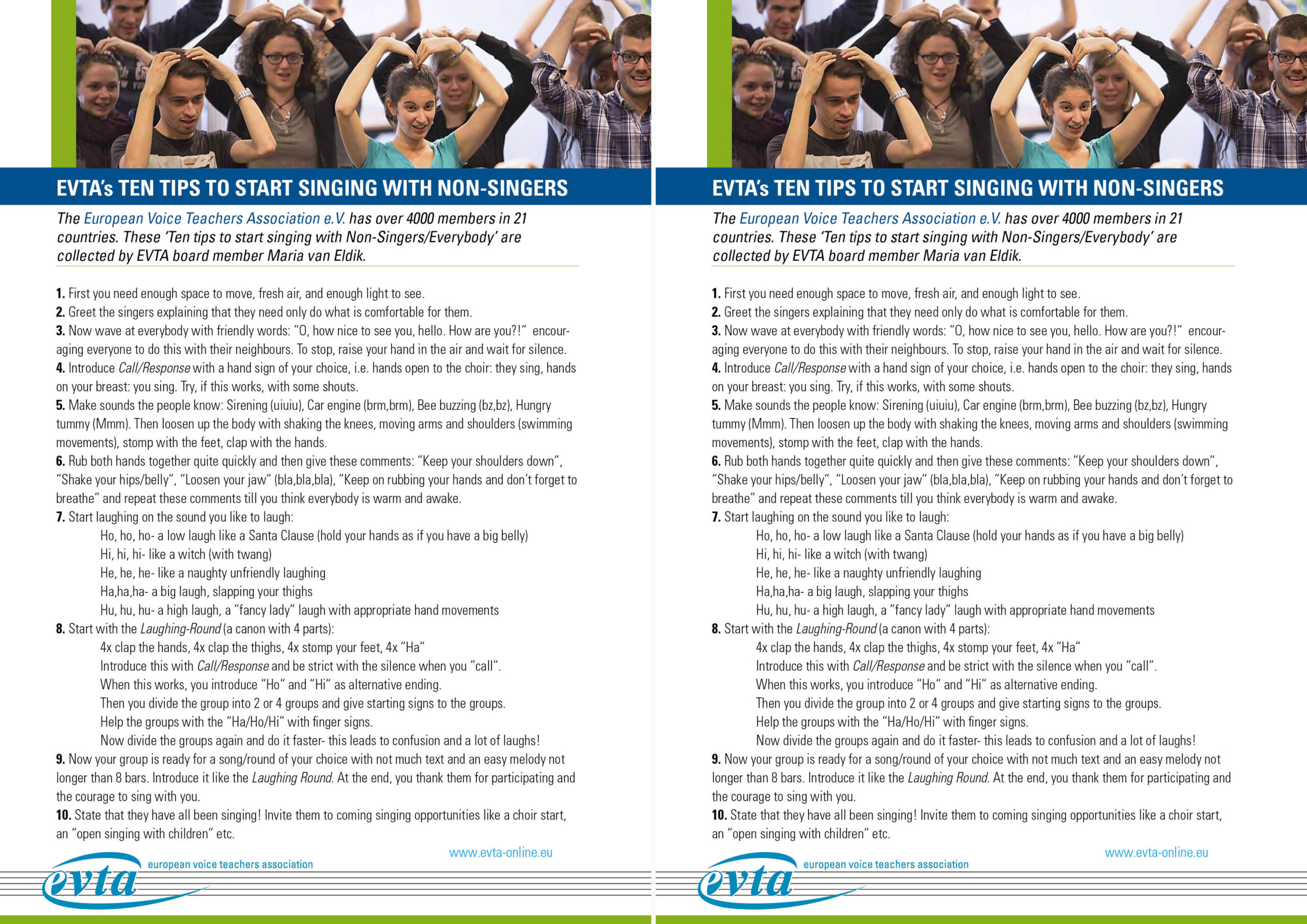 To help teachers who want to work with Non-Singers EVTA here offers an A5 card with ten tips. You can download and print it to use for you and your fellow teachers!